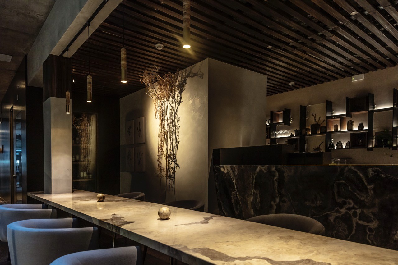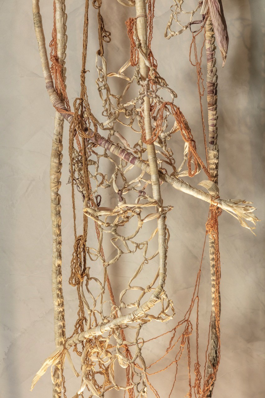 Mater convoca a la artista plástica peruana Andrea Tapia, por su trabajo con fibras vegetales y formas orgánicas, para que realice una residencia de arte y desarrolle piezas utilitarias que formen parte de las propuestas gastronómicas de Central, Kjolle y MIL. El proyecto se hizo junto a ocho integrantes de la asociación Maras K’ampa, un grupo de mujeres tejedoras que utilizan la fibra de k’ampa (o panca), como material para tejer. En Lima, la artista estudió los platos, colores y estética de los restaurantes para diseñar prototipos que luego desarrolló junto a las artesanas en Maras. Durante dos meses, combinaron técnicas tradicionales con las introducidas por la artista. El resultado fueron piezas que hoy son parte de la experiencia gastronómica de los restaurantes y de la tienda Mater, revalorizando los conocimientos de las mujeres y generando oportunidades económicas. Para la artista, la residencia fue un espacio de aprendizaje y conexión que dio origen a su obra Raíz, tejida en homenaje a esos vínculos y que se exhibe en el salón de Central.