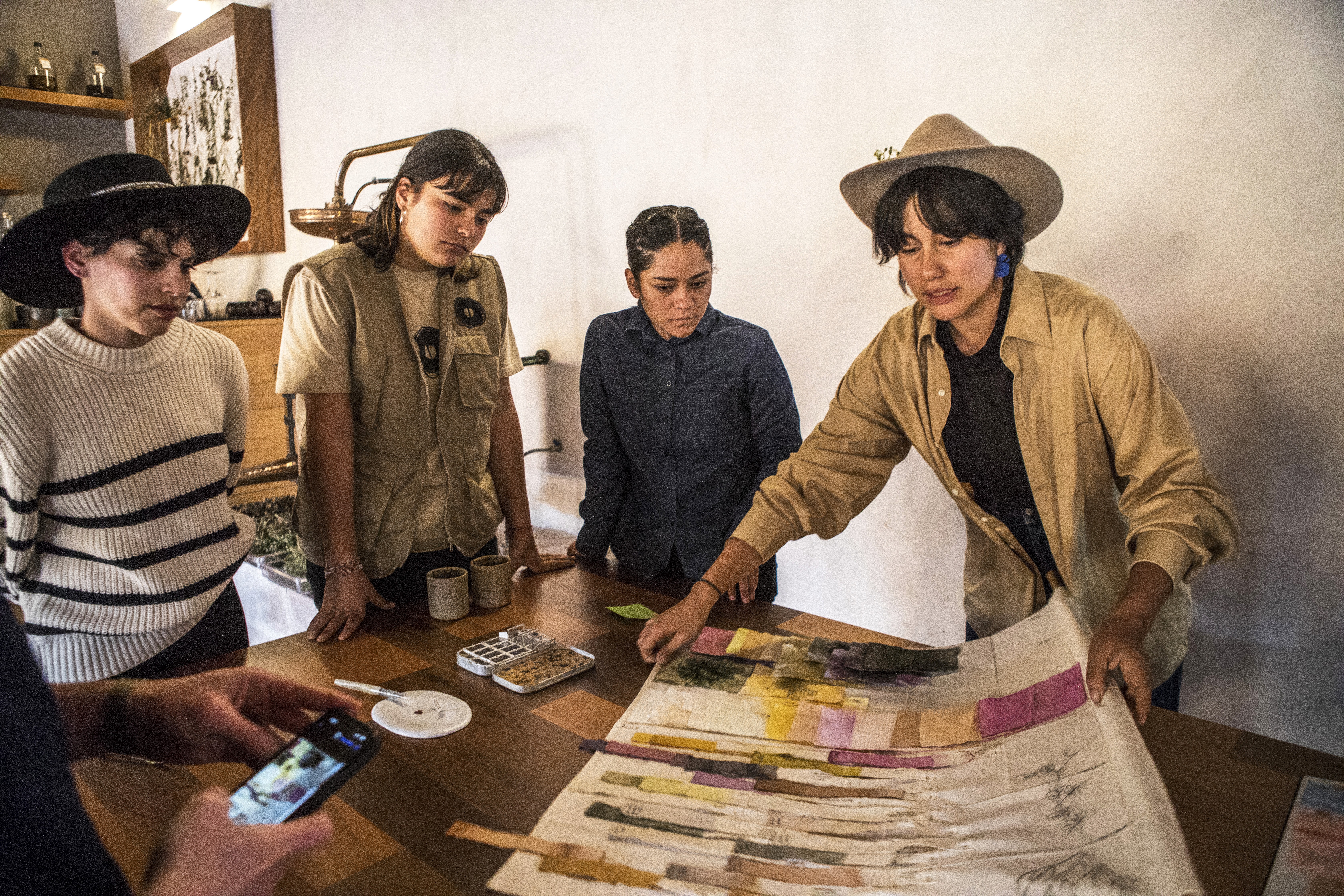 La diseñadora italiana e investigadora de plantas tintóreas Giulia Pompilij realizó una residencia artística de seis meses en Moray, Cusco. Allí descubrió que las condiciones ambientales del entorno modificaban los procesos de teñido que conocía. Su trabajo junto a Ceferina Atau, conocedora de plantas locales y de las prácticas tradicionales de teñido teñido, llevó a la creación del colectivo Warmis, conformado por 16 mujeres de la comunidad vecina de K’acllaraccay. El grupo recolecta plantas, tiñe lanas, hila y teje usando técnicas ancestrales. Toman los recursos disponibles según la temporada, y conservan otros mediante deshidratación para hacer uso de ellos a lo largo del año. El colectivo Warmis es el resultado de la residencia y sigue activo siete años después. Sus creaciones se encuentran en MIL, donde los visitantes pueden conocer su cultura, sus saberes y las prácticas tradicionales de tejido y teñido que guardan relación con el territorio.